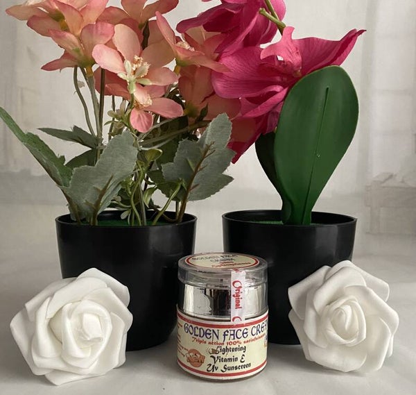 Golden Face Cream with Sunscreen – 50g - Lightens the face by fading away pimples, acne scars and dark spots. Contains sunscreen to help pprotect your face from UV rays.